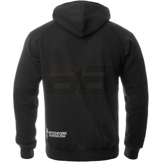 Pitchfork Casual Hoodie mit kühnem Dreizack in der Mitte der Vorderseite und PFS-Logo am hinteren Saum. Bequeme, lockere Passform, 70/30 Baumwoll-Polyester-Mischung für Wärme. Produktinformationen am Hals gedruckt, um Unbehagen durch Etiketten zu vermeide