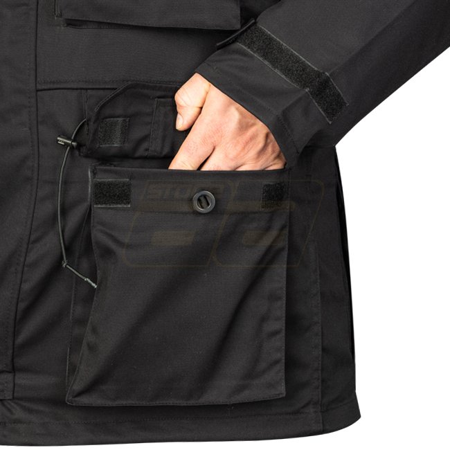 Die Pitchfork Commando Smock in Schwarz - Größe S ist eine robuste und vielseitige Jacke, die für anspruchsvolle Benutzer entwickelt wurde. Sie ist aus strapazierfähigem PolyCotton-Material gefertigt und verfügt über eine verstellbare Kapuze, elastische K