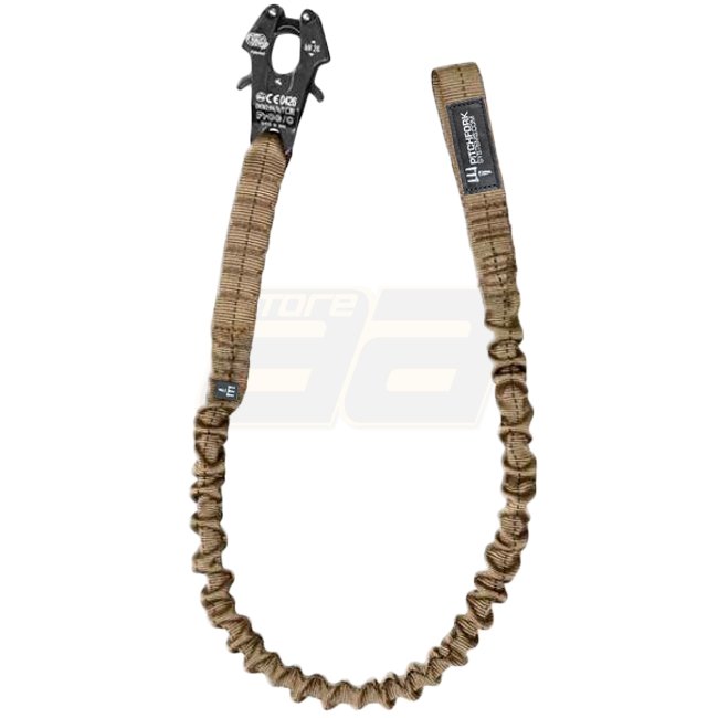 Hochwertiges Pitchfork Retention Safety Lanyard in Coyote-Farbe zum Sichern von Personen auf Schiffen, Fahrzeugen oder Hubschraubern. Verfügt über einen einhändig bedienbaren Kong FROG Schnallenverschluss für schnellen Anschluss an Ankerpunkte.