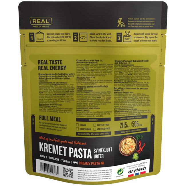 Um unter schwierigen Bedingungen arbeiten zu können, muss sichergestellt sein, dass die Ernährung ausgewogen ist und ausreichend Kohlenhydrate, Fett und Eiweiß enthält. REAL Field Meal wird von einem erfahrenen Team von Köchen zubereitet, um eine nahrhafte und leichte Mahlzeit zu sichern - einfach zuzubereiten und reich an natürlichem Geschmack.
