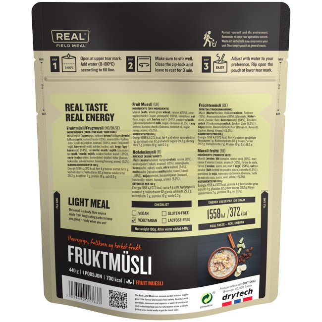 Um unter schwierigen Bedingungen arbeiten zu können, muss sichergestellt sein, dass die Ernährung ausgewogen ist und ausreichend Kohlenhydrate, Fett und Eiweiß enthält. REAL Field Meal wird von einem erfahrenen Team von Köchen zubereitet, um eine nahrhafte und leichte Mahlzeit zu sichern - einfach zuzubereiten und reich an natürlichem Geschmack.
