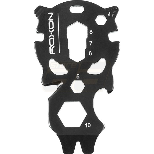 Kompatte Roxon Multi-Tool 9 in 1 - Schwarz mit grundlegenden Funktionen für den täglichen Gebrauch. Kreuz- und Schlitzschraubendreher, Speichenschlüssel, Seilschneider, Flaschenöffner und mehr. Robustes Edelstahl, 6,2 x 3,5 x 0,2 cm.