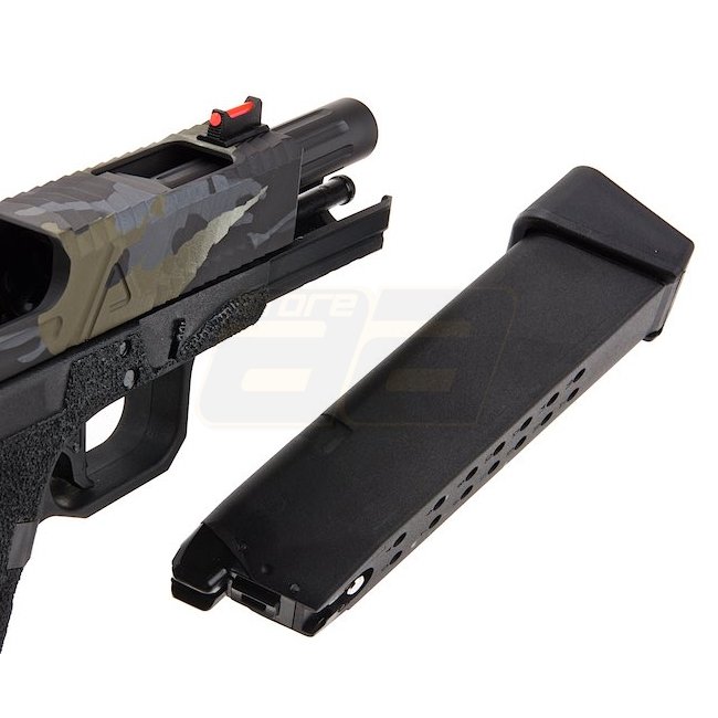 RWA Agency Arms EXA Gas Blow Back Pistole in Cerakote Multicam Schwarz - leichtes und langlebiges Design, mit einstellbarem Hop-Up und halbautomatischem Schussmodus. Enthält ein 23-Schuss Magazin und hat eine Reichweite von 41,16-43,90 m.