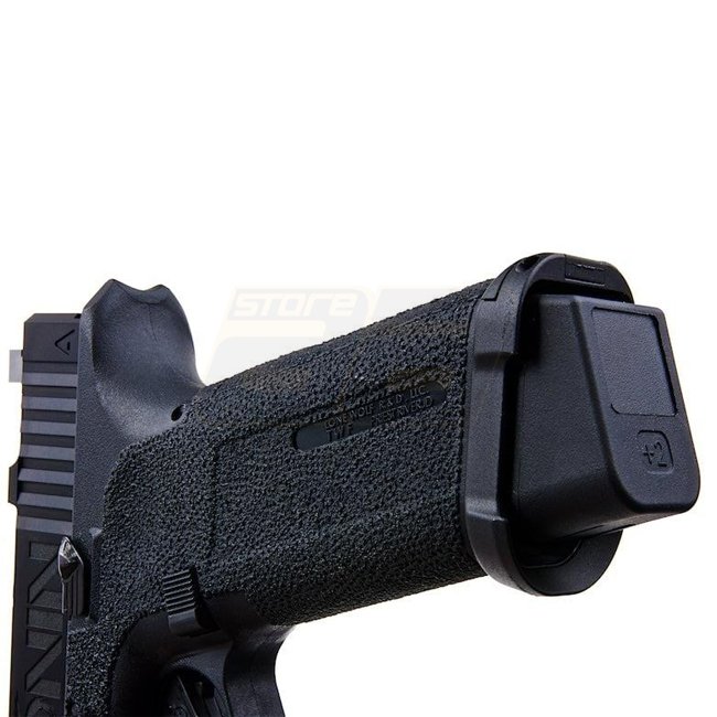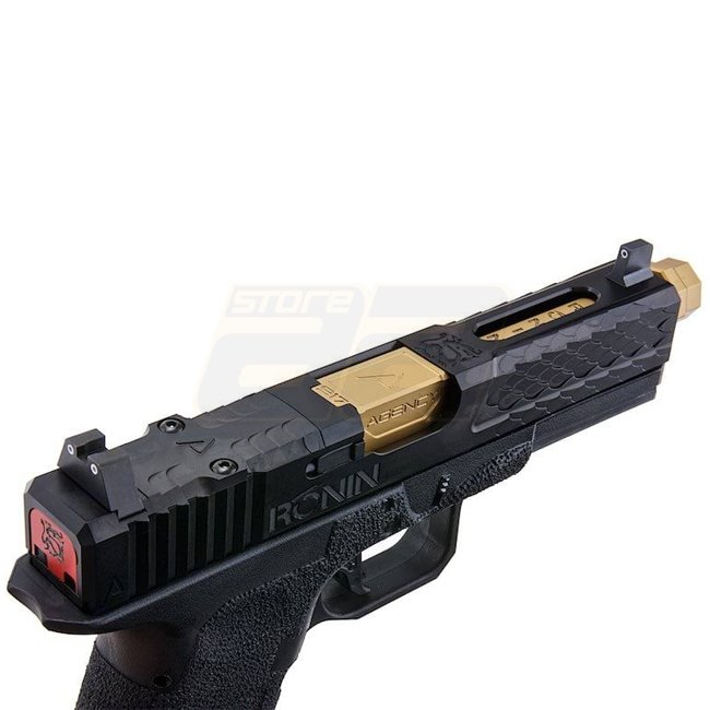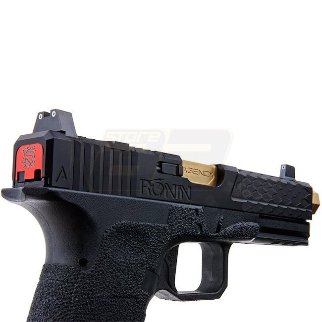 RWA Agency Arms Ronin Gas Blow Back Pistole - Metall/Kunststoff, 23 Schuss Magazin, 240mm Länge, 690g Gewicht, 85mm Innenlauf, 300-320 FPS, Halbautomatisch, 41.16-43.90m Schussreichweite. Einstellbares Hop-Up einschließlich Waffe und Magazin.