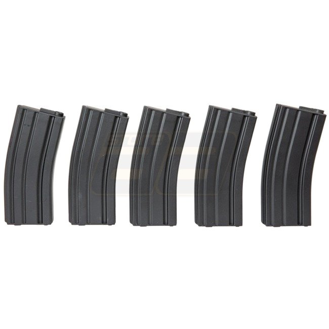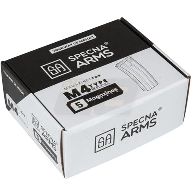 Hochwertiges Specna Arms M4 140 Schuss Polymer Magazin Set in elegantem Schwarz. Ideal für M4/M16 AEG-Gewehre. Das Set umfasst 5 Magazine, jedes mit einer Kapazität von 140 Schuss. Hergestellt aus strapazierfähigem Polymer-Material und leicht mit 115 g.