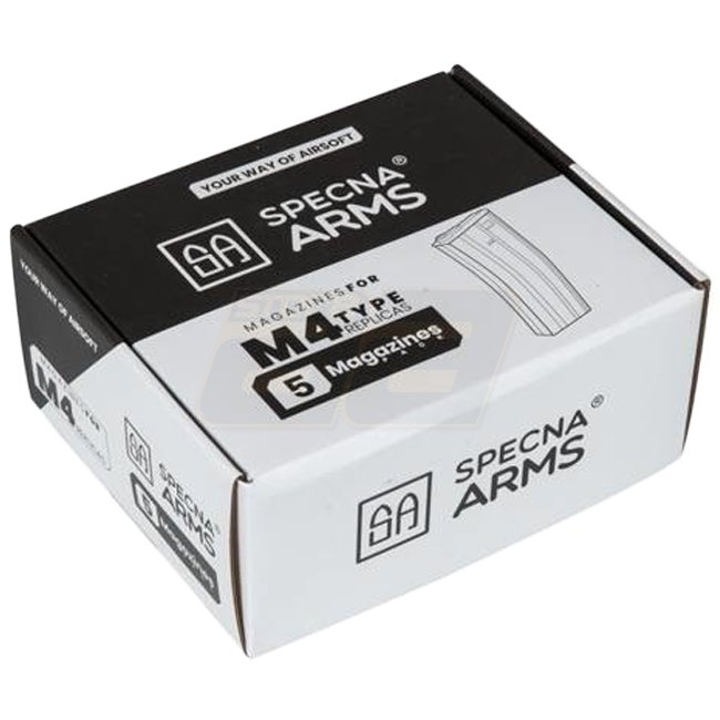 Hochwertiges Specna Arms M4 300rds Metallmagazinsatz in Sandfarbe. Kompatibel mit M4/M16 AEG-Gewehren. Set mit 5 Magazinen, jedes mit einer Kapazität von 300 Schuss. Strapazierfähige Metallkonstruktion, Gewicht 220 g pro Magazin.