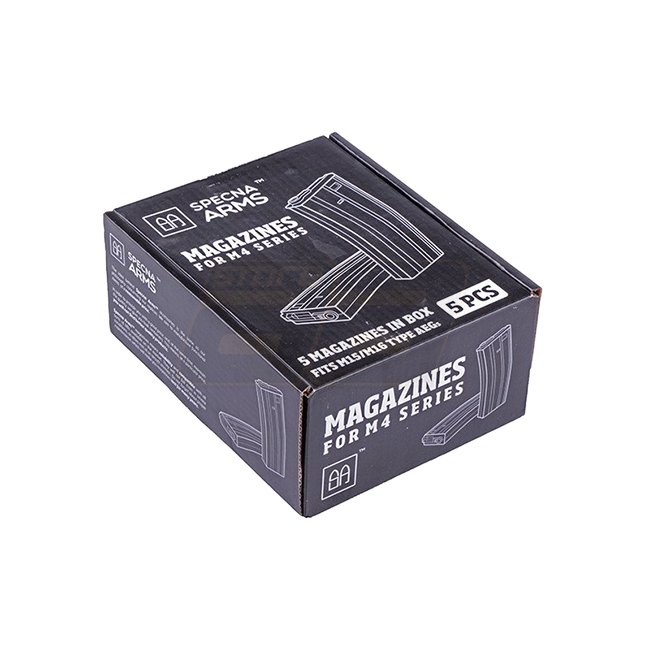 Dieses Specna Arms M4 30rds Metal Magazinset in Tan ist ein unverzichtbares Zubehör für M4/M16 AEG-Gewehre. Das Set umfasst 5 Magazine aus robustem Metallmaterial, jedes mit einer Kapazität von 30 Schuss. Mit einem Gewicht von nur 190g sind diese Magazine