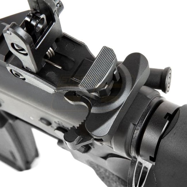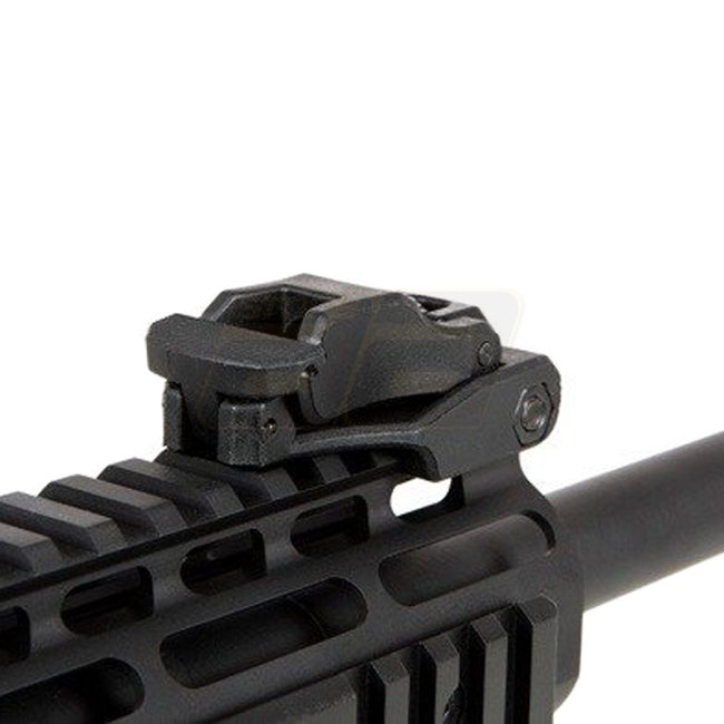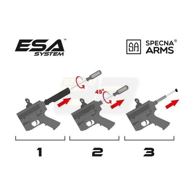 Die Modelle der Specna Arms EDGE E-Serie verfügen über ein nanobeschichtetes Metall Gehäuse. Im Innern sorgt eine robuste "ORION“ Gearbox für Zuverlässigkeit und Flexibilität, da diese mit dem "ESA“ Federschnellwechselsystem ausgestattet sind. Dadurch lässt sich die Leistung mit nur wenigen Handgriffen verändern. Des Weiteren ist die Gearbox bereits mit einem GATE X-ASR Mosfet ausgestattet. Die verbauten Teile erlauben die Verwendung unterschiedlich starker Federn (bis M140). Der 6.03mm Innenlauf kombiniert mit einer Präzisions-HopUp Unit mit umlaufendem Einstellrad sorgt für die nötige Präzision. Specna Arms liefert neben der ab Werk verbauten Feder eine zusätzliche M90 Feder mit, womit sich die Leistung der AEG auf ca. 310 FPS reduzieren lässt.