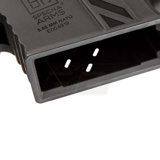 Die Modelle der Specna Arms EDGE E-Serie verfügen über ein nanobeschichtetes Metall Gehäuse. Im Innern sorgt eine robuste "ORION“ Gearbox für Zuverlässigkeit und Flexibilität, da diese mit dem "ESA“ Federschnellwechselsystem ausgestattet sind. Dadurch lässt sich die Leistung mit nur wenigen Handgriffen verändern. Des Weiteren ist die Gearbox bereits mit einem GATE X-ASR Mosfet ausgestattet. Die verbauten Teile erlauben die Verwendung unterschiedlich starker Federn (bis M140). Der 6.03mm Innenlauf kombiniert mit einer Präzisions-HopUp Unit mit umlaufendem Einstellrad sorgt für die nötige Präzision. Specna Arms liefert neben der ab Werk verbauten Feder eine zusätzliche M90 Feder mit, womit sich die Leistung der AEG auf ca. 310 FPS reduzieren lässt.