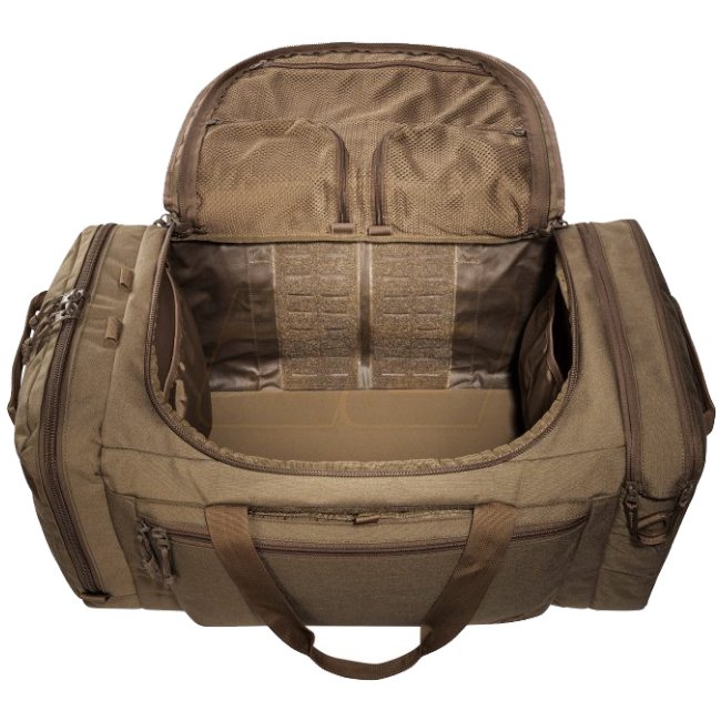 Universelle Ausrüstungstasche mit 58 Liter Volumen. Die TT Officers Bag besitzt neben dem Hauptfach an jeder Stirnseite eine Seitentasche. Eine davon ist mit einem Doppelreißverschluss versehen, um eine IFAK-Tasche für den Schnellzugriff unterzubringen, die andere ist mit MOLLE-Klett ausgestattet. Auch die Stirnseite des Hauptfachs ist mit MOLLE-Klett belegt. Das Hauptfach der Tasche besitzt abschließbare Reißverschlüsse. Die Tragegriffe lassen sich verstauen, und die Tasche kann bei Bedarf mit gepolsterten Rucksack-Schultergurten versehen werden. Diese sind im Deckel in einer Reißverschlusstasche verstaut.