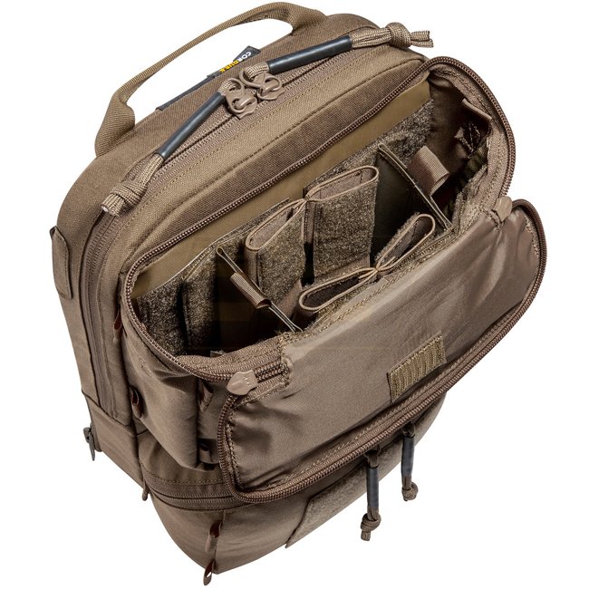 Der TT Operator Pack ZP ist konzipiert für den TT Plate Carrier QR LC ZP, die Befestigung erfolgt über seitliche Reißverschlüsse. Der Pack kann auch auf anderen am Markt befindlichen Plattenträgern mit entsprechender Reißverschlusslänge und -breite montiert werden. Zudem besteht durch den mitgelieferten Reißverschluss-MOLLE-Streifen die Möglichkeit, ihn auf Plattenträgern mit demselben MOLLE-Schema zu befestigen. Zur Befestigung an klassischen MOLLE-Bändern liegt ein zusätzlicher Adapter bei. Der Rucksack besitzt ein flaches Hauptfach, das mit einer Trinksystemvorbereitung versehen und dessen Rückwand mit MOLLE-Klett zur individuellen Bestückung belegt ist. Außerdem verfügt er über zwei große Fronttaschen. Die obere Fronttasche ist mit auswechselbaren Magazineinsätzen ausgestattet. Die modularen Bauteile können auch im Hauptfach befestigt werden.