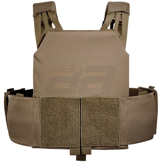 Leichter, flacher Plattenträger mit neutraler Front. Der Träger ist als Unterziehträger ausgelegt. Er besitzt eine längenverstellbare, elastische Seitenbefestigung sowie zwei fixe und zwei abnehmbare elastische Seitentaschen für Magazine, Funkgerät oder Kleinteile. Die Frontseite bietet keine Befestigungsmöglichkeiten. Die Größe S/M ist für gängige SAPI-Platten bis 30 x 25 cm ausgelegt, die Größe L bis 33 x 26 cm.