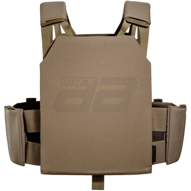 Leichter, flacher Plattenträger mit neutraler Front. Der Träger ist als Unterziehträger ausgelegt. Er besitzt eine längenverstellbare, elastische Seitenbefestigung sowie zwei fixe und zwei abnehmbare elastische Seitentaschen für Magazine, Funkgerät oder Kleinteile. Die Frontseite bietet keine Befestigungsmöglichkeiten. Die Größe S/M ist für gängige SAPI-Platten bis 30 x 25 cm ausgelegt, die Größe L bis 33 x 26 cm.