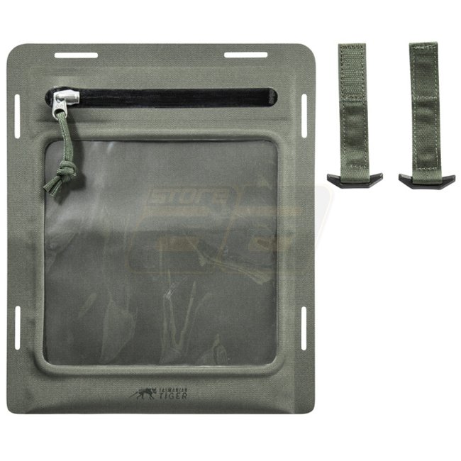 Wasserabweisende Tablet-Hülle mit Touchscreen-kompatiblem Sichtfenster. Adapter zur Befestigung auf Molle-Klett-Flächen im Lieferumfang inbegriffen.