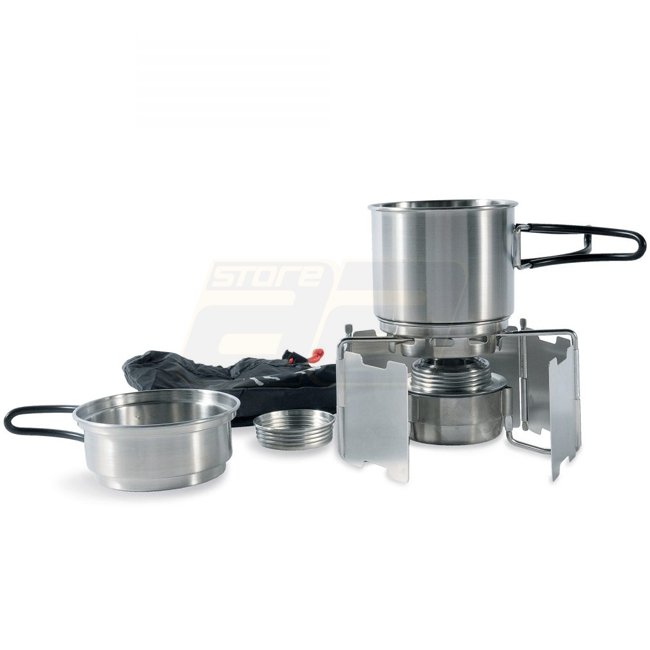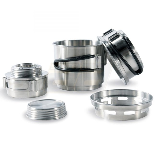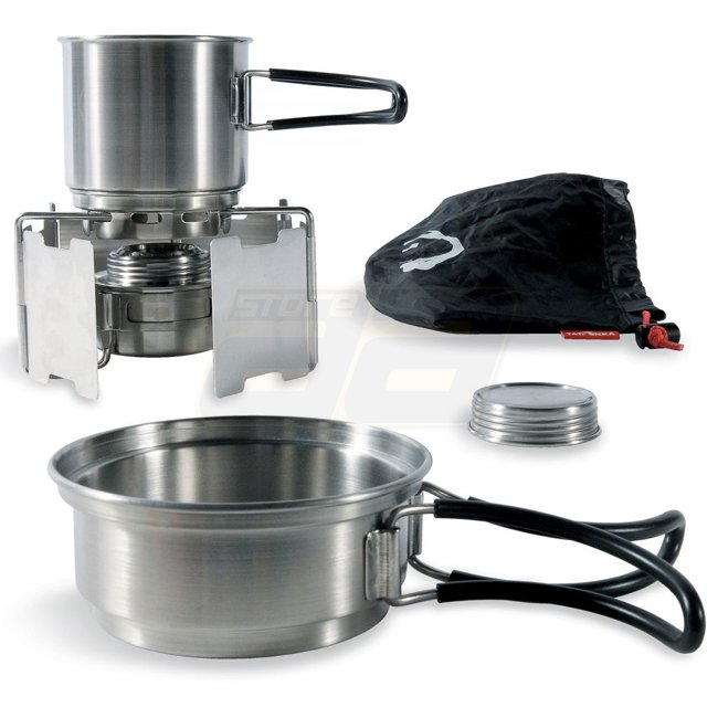 Das Kochset besteht aus Spiritus-Kocher, Faltwindschutz (Aluminium) und einem Becher mit Deckel, der gleichzeitig als Topf dient. Inklusive Packsack für das Verstauen des gesamten Camping-Geschirrs.