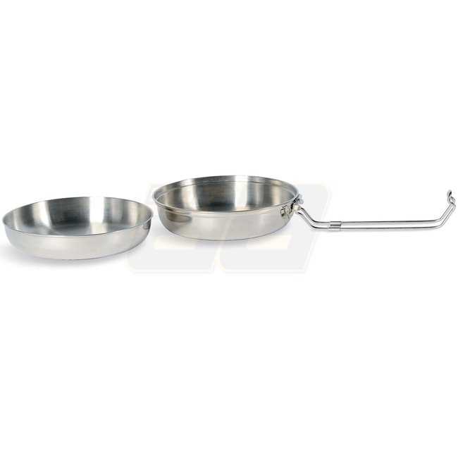 Zwei-teiliges Kochtopfset aus Edelstahl, Tatonka Scout Set 1,0 l, das als Topf, Schüssel und Teller verwendet werden kann. Lebensmittelecht, leicht zu reinigen und unzerbrechlich. Enthält Klemmlock, 1,0-Liter-Topf, Schüssel, Teller. Abmessungen: 18,5 x 18