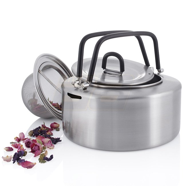 Teekessel aus Edelstahl mit 1,0 Liter Volumen, Deckel und integriertem Sieb.