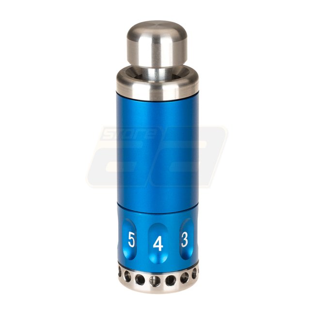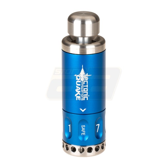 Tectonic Quake 8-Wege Hochimpulsgranate in blauer Farbe. Hergestellt aus robustem Stahl und Aluminium in Luftfahrtqualität für hohe Schlagfestigkeit und mehrfachen Einsatz. Verfügt über 8 Fächer für .209 Zünder, mit Detonierungseinstellungen von 1 bis 8.