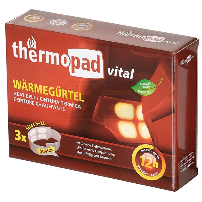 Thermopad Wärmegürtel 3 Stk - Heizt bis zu 12 Stunden, Temperatur bis zu 48°C, aktiviert durch Sauerstoff. Verstellbarer Gürtel, 10 x 9 cm. Eisenpulver, Salz, Aktivkohle. Nach Gebrauch im Restmüll entsorgen.