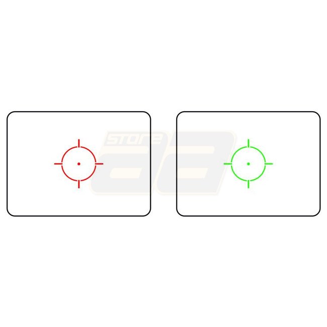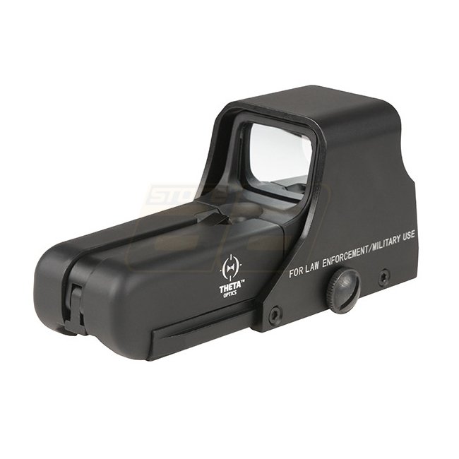 Theta Optics TO552 Rotpunktvisier in schwarzer Farbe mit 1x Vergrößerung, 30x20mm Linse und beleuchtetem roten & grünen Absehen. Wird mit Circle-Dot-Absehen, Wind- und Höhenverstellung, 2x AAA-Batterien und 20mm Picatinny-Montage geliefert. Länge: 132mm.