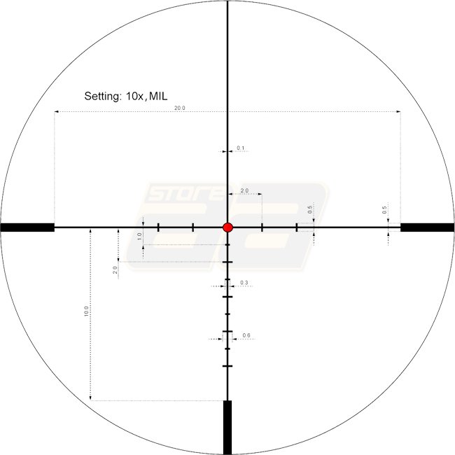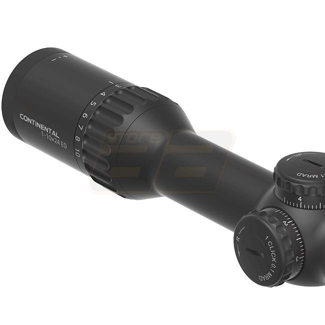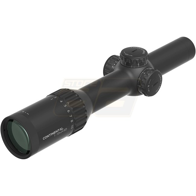 Der Continental X10 bietet einen Vergrößerungsbereich von 1–10× mit echtem 1× Modus für beidhändiges Zielen. Das Second-Focal-Plane-Absehen VCO-7MIL mit Faserzentrum und 11 Leuchtstufen bleibt auch bei Tageslicht sichtbar. Die Optik mit German Schott HT, LaREE & VePRO FMC ED Glas und über 93 % Lichttransmission liefert helle, gestochen scharfe Bilder.