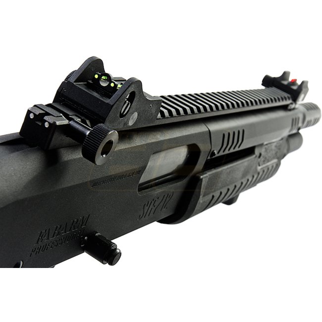 VFC Fabarm STF12 Compact 11 Zoll Gas-Schrotflinte - Schwarz ist eine leistungsstarke und kompakte Airsoft-Schrotflinte. Hergestellt aus Metall mit Kunststoff-Vorderschaft und -Schulterstütze. Verfügt über ein Magazin mit einer Kapazität von 30 Schuss, ein