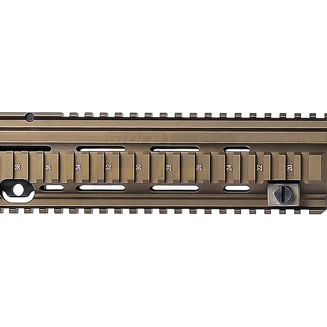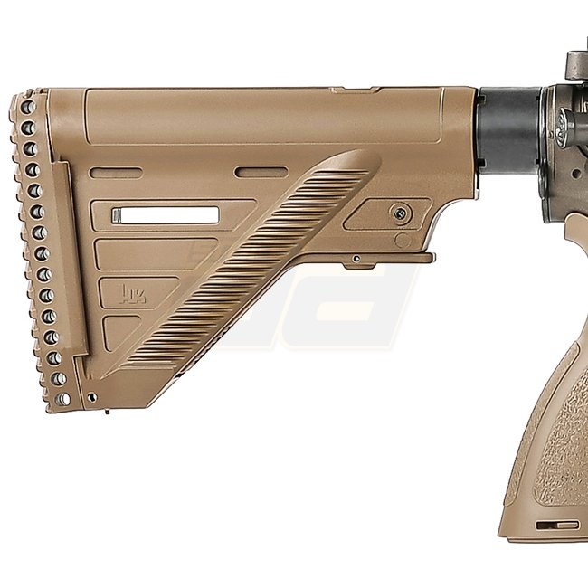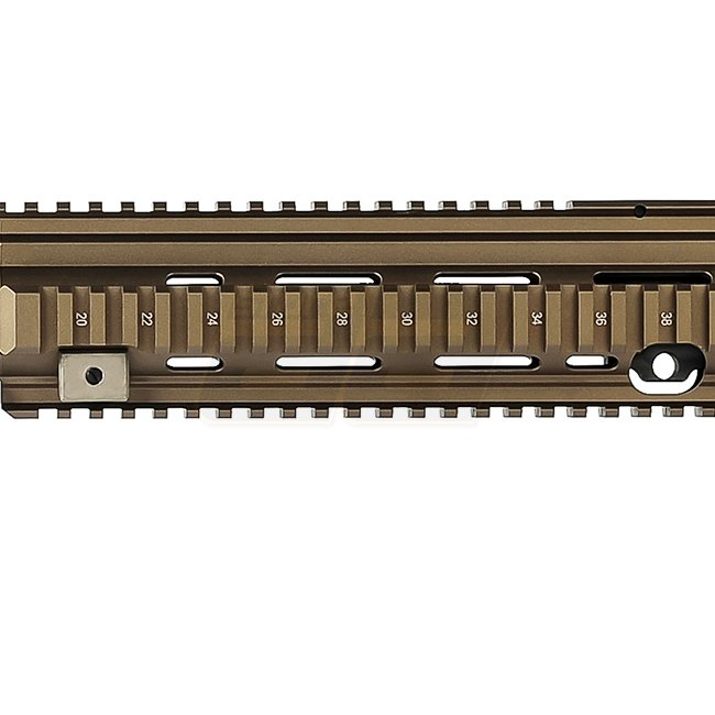 Verschlussfanghebel, Feuerwahlhebel sowie Magazinhalter finden sich bei der A5 Ausführung der HK416 beidseitig, was dieses Modell auch für Linkshänder äusserst interessant macht. Die Innenteile der Abzugseinheit sind derweil aus Stahl gefertigt, was diese neue Version noch zuverlässiger macht. Der Aussenlauf sowie der Feuerscheindämpfer sind wie beim Original ebenfalls aus Stahl gefertigt, der in 5 Stufen verstellbare Schaft und der Pistolengriff sind aus Kunststoff, wobei sich in letzterem ein Fach findet, in dem Kleinteile wie Werkzeug etc. untergebracht werden kann. Das Schienensystem sowie das Hauptgehäuse sind aus robustem Aluminium hergestellt und weisen die originalen Markierungen auf.