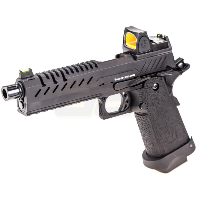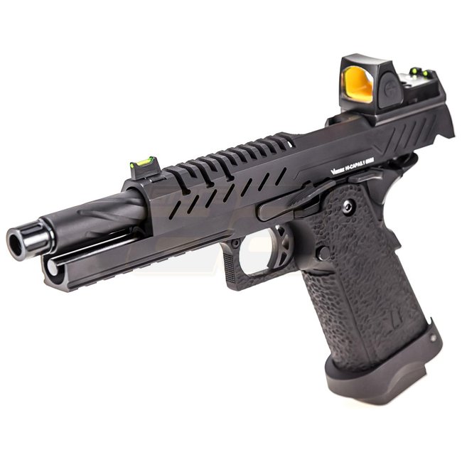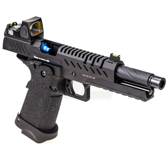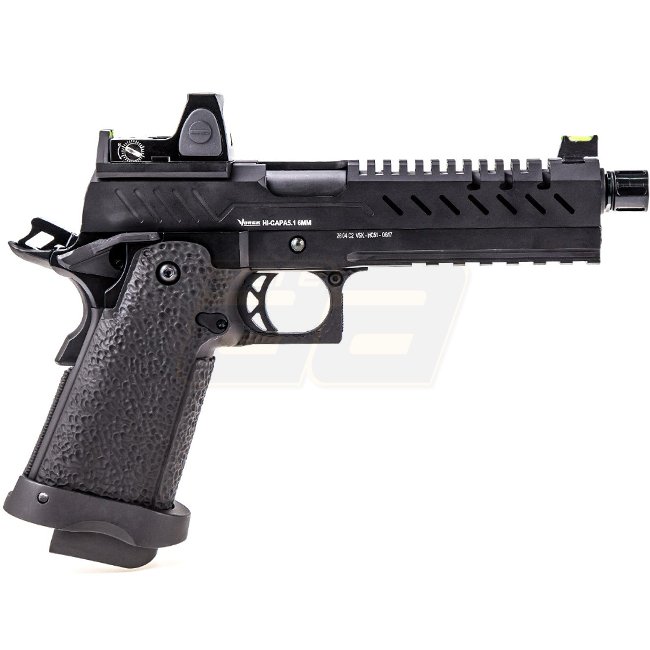 Eine hochwertige Vorsk Hi-Capa 5.1 & BDS Gas Blow Back Pistole in elegantem Schwarz. Metall- und Polymerkonstruktion, 24-Schuss-Magazin, 245mm Länge, 960g Gewicht, 110mm Innenlauf, 340-360 FPS/1.07-1.20 Joule Geschwindigkeit, halbautomatischer Feuermodus,