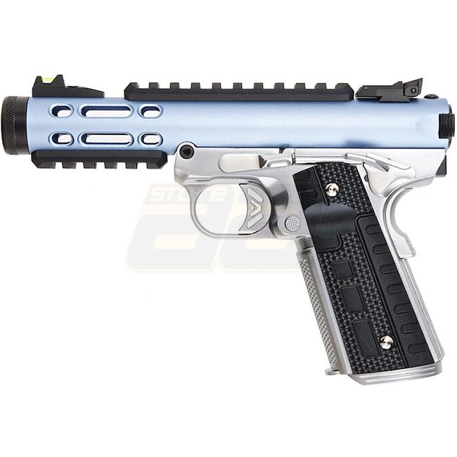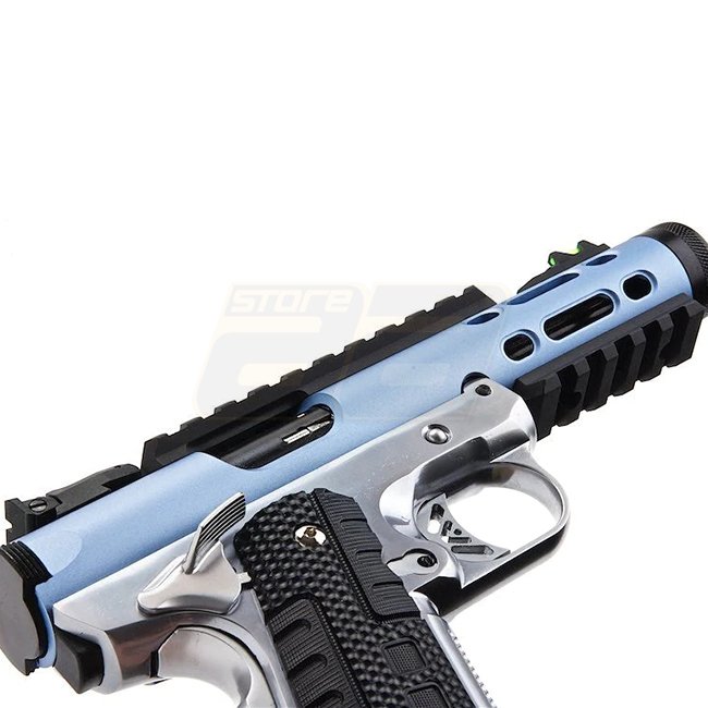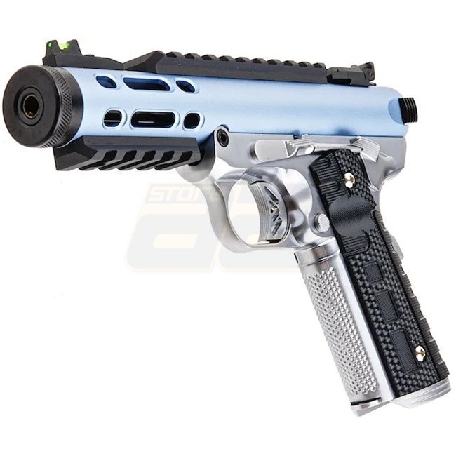WE Galaxy 1911 Gas Blow Back Pistole Silberner Rahmen - Blau ist eine hochwertige Airsoft-Waffe mit einem Metall/Polymer-Gehäuse, 15 Schuss Magazin, 245 mm Länge, 1040 g Gewicht und 115 mm Innenlauf. Sie bietet eine Mündungsgeschwindigkeit von 280-300 FPS