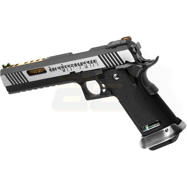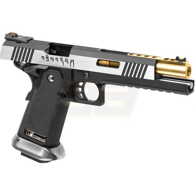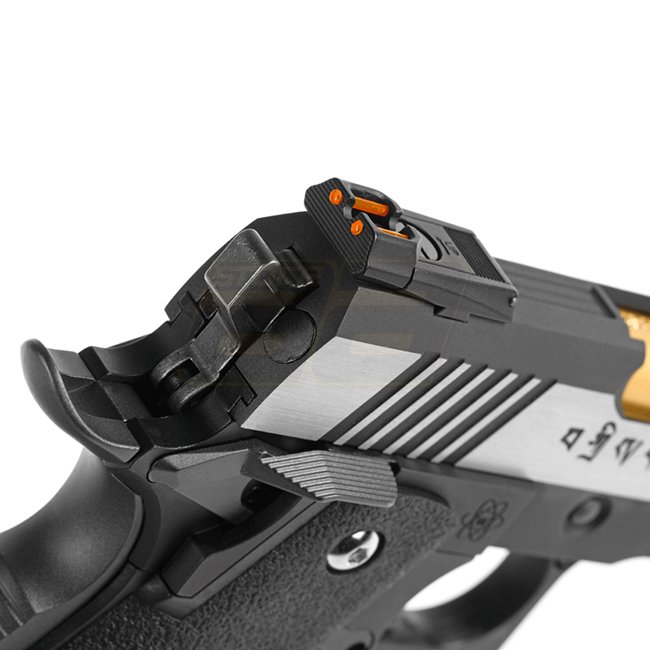 WE Hi-Capa 6 Force A Gold Barrel Gas Blow Back Pistole - Dual Tone, Semi-Auto, Metall / Polymer, 31-Schuss Kapazität, 245mm Länge, 1100g Gewicht, 133mm Innenlauf, 350-370 FPS Geschwindigkeit, 1.14-1.27 Joule, Schussreichweite von 48.02-50.76m, Einstellbar