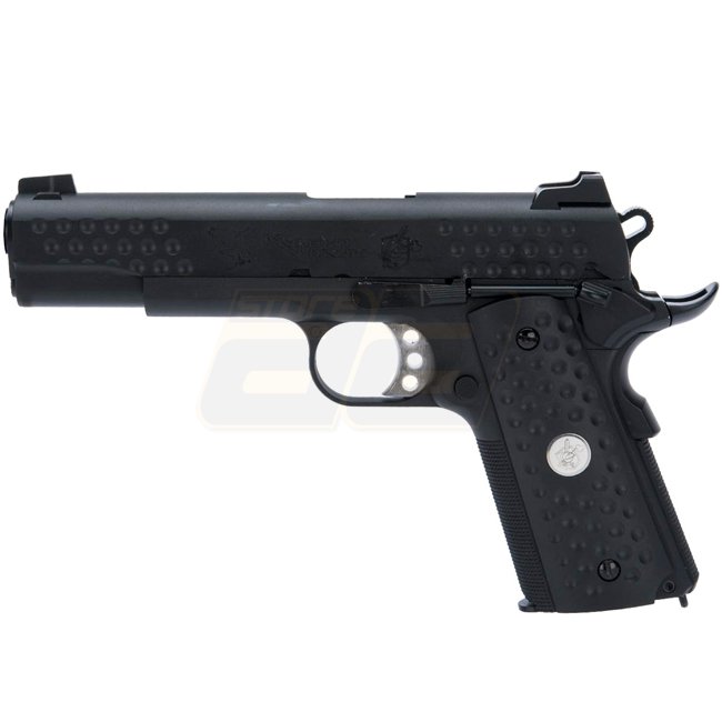 Die WE Knight Hawk ist eine hochwertige Gas-Blow-Back-Airsoftpistole im klassischen 1911-Design mit modernem Custom-Finish. Das markante "Golfball"-Muster an Schlitten und Griffschalen sorgt für eine einzigartige Optik und bietet gleichzeitig eine rutschfeste Oberfläche.