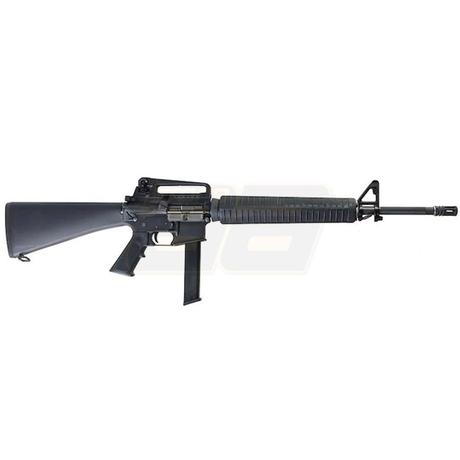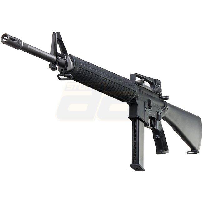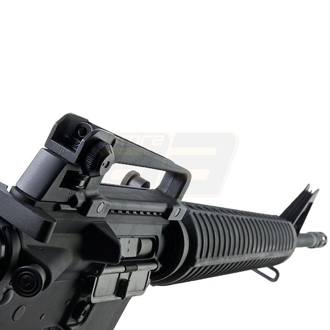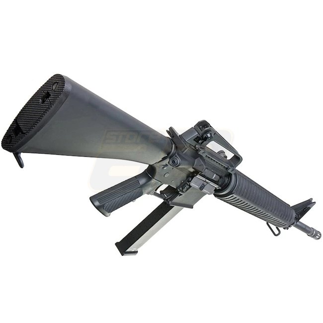 WE M16A3 PCC Gas Blow Back Gewehr in schwarzer Farbe, mit einer Konstruktion aus Metall und Polymer, und einem Magazin mit einer Kapazität von 50 Schuss. Dieses Gewehr hat eine Länge von 990 mm, wiegt 3890 g und hat eine Innenlauf-Länge von 470 mm. Es wir