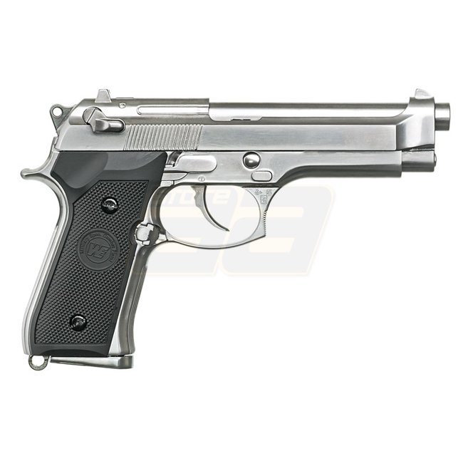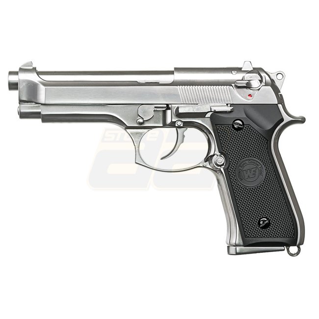 WE M92F Gas Blow Back Pistole - Silber. Metallkörper mit Kunststoffgriff, 25-Schuss-Magazin, 215 mm Länge, 1050 g Gewicht, 85 mm Innenlauf Länge. Mündungsenergie 320-340 FPS / 0,95-1,07 Joule, halbautomatischer Schussmodus, Schussreichweite 43,90-46,65