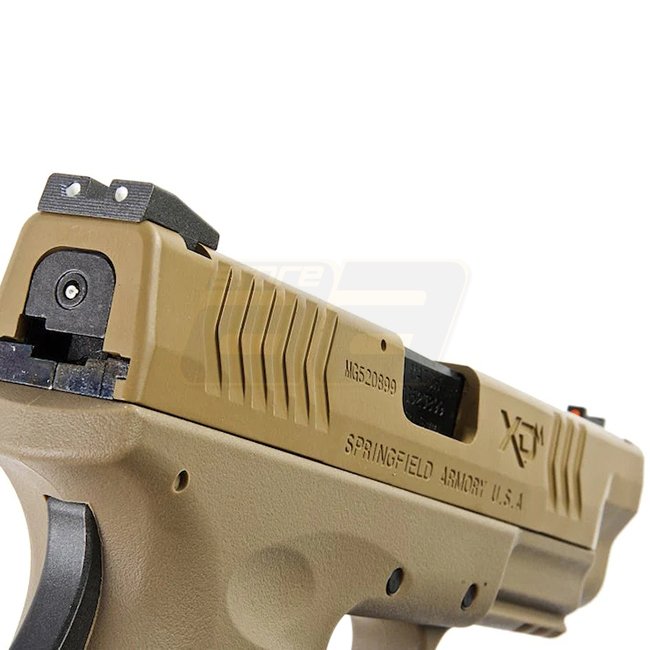 WE Springfield Armory XDM 4.5 Gas Blow Back Pistole in Tan-Farbe, mit Metall- und Polymerkonstruktion, 25 Schuss Magazin Kapazität, 210mm Länge, 844g Gewicht und einer Schussreichweite von bis zu 48,02 m. Perfekt für halbautomatisches Schießen mit einstel