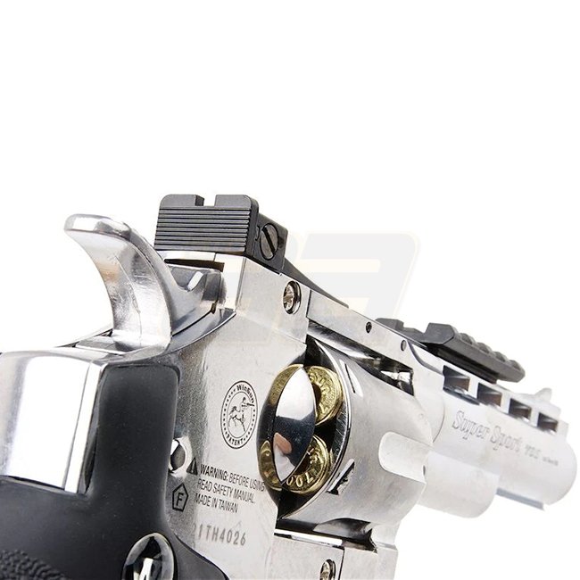 WinGun Revolver Co2 701 4 Zoll Schwarzer Griff - Silber, Metall/Kunststoffgriff, 6 Kugeln, 275 mm Länge, 960 g Gewicht, 350-370 FPS, Semi Auto, 48,02-50,76 m Schussreichweite, Festes Hop Up