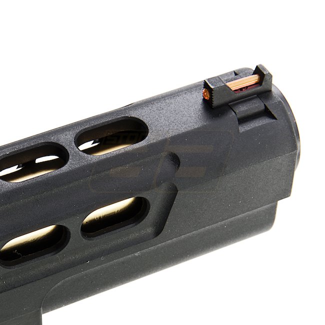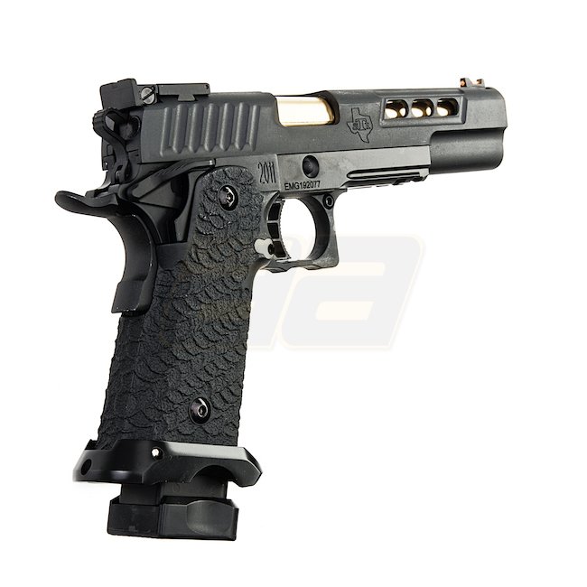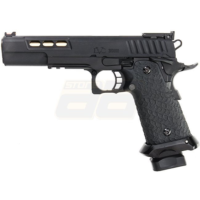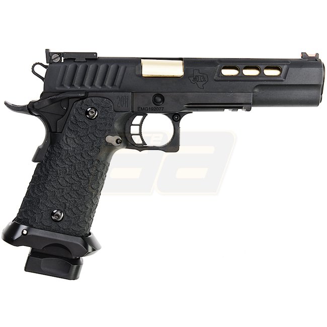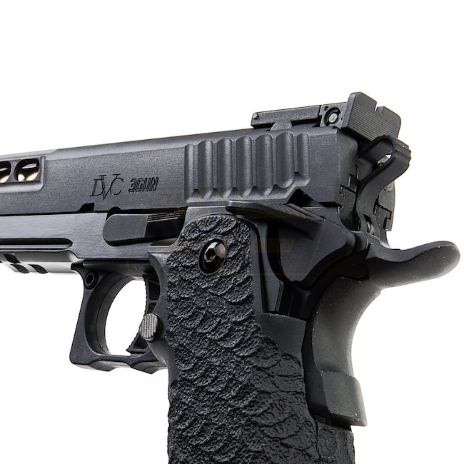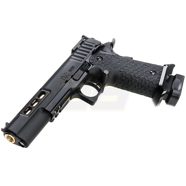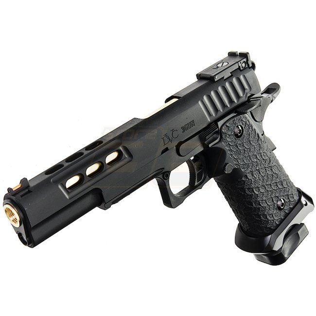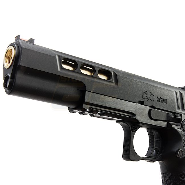 EMG STI DVC 3-GUN 2011 Gas Blow Back Pistol in Black with metal slide and frame, plastic grip, 28 round magazine capacity, shooting in Semi Auto mode with adjustable hop up. Package includes gun and magazine. Length: 230mm, weight: 1140g, inner barrel len