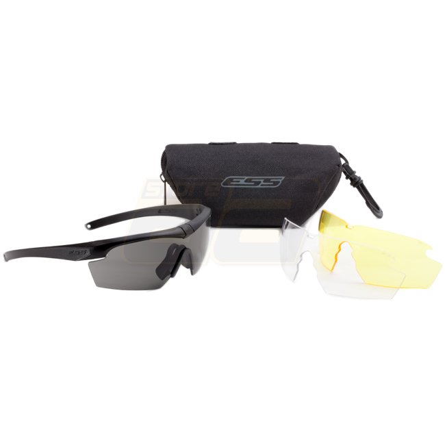 ESS Crosshair 3LS Kit in black is a durable eyewear kit with ballistic protection, complying with U.S. MIL SPEC and ANSI Z87.1-2010 standards. Provides 100% UVA/UVB protection.