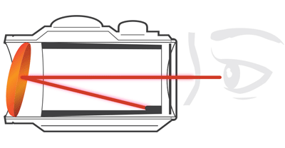 Red Dot Lens Positioning: All red dot sights have an objective lens at the front of the unit that is spherical in shape. However, unlike a conventional riflescope, the objective lens in a red dot sight is positioned off axis and appears to be tilted when looking at the sight. This angle of the front lens allows the light generated by the battery powered LED light source inside the unit to be reflected back into the sight. The reflected light becomes the "dot" or aiming reference that the user sees when a red dot sight is switched on.