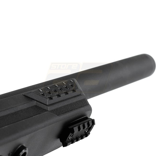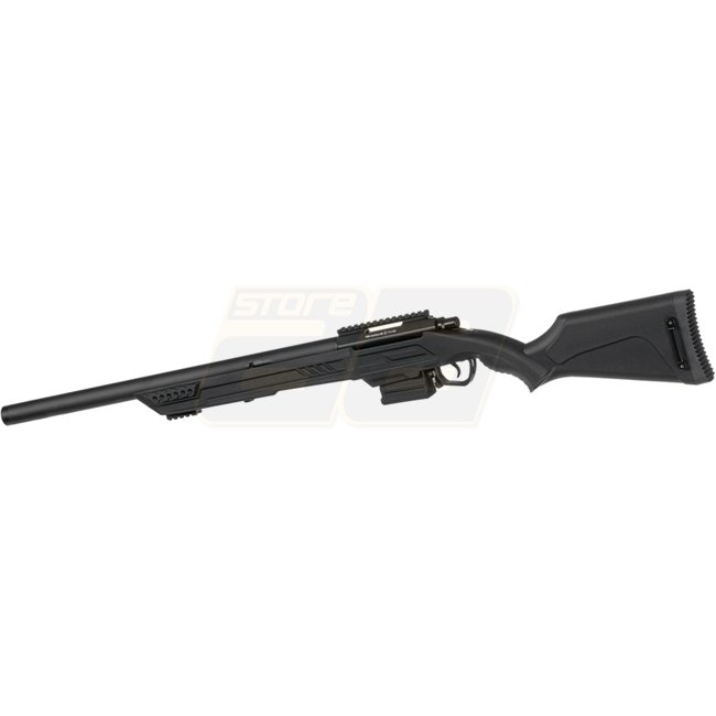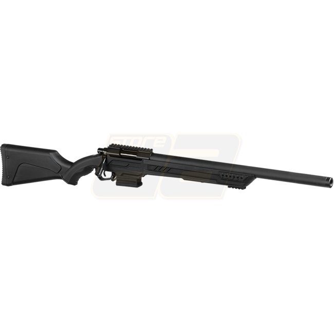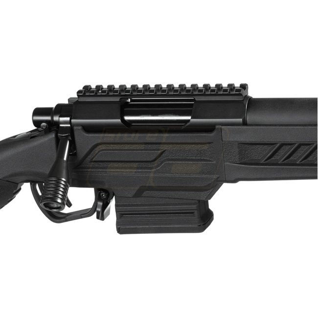 Fusil de précision à ressort Action Army AAC T11 - Noir est un fusil de précision de haute qualité avec un système à ressort, une crosse en métal/polymer, une capacité de chargeur de 50 cartouches, une longueur de 1100 mm, un poids de 2200 g, une longueur