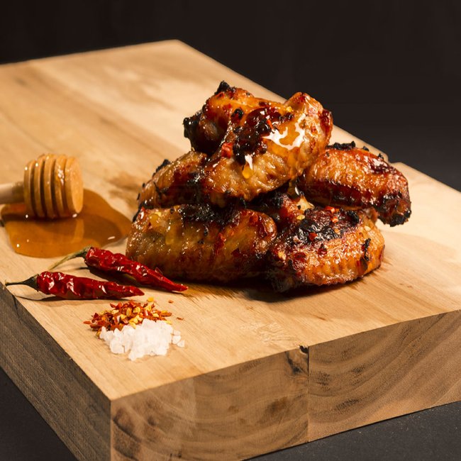 Composition: Ailes de poulet (97%), miel (1,4%), sel (sel, iodate de potassium), piment