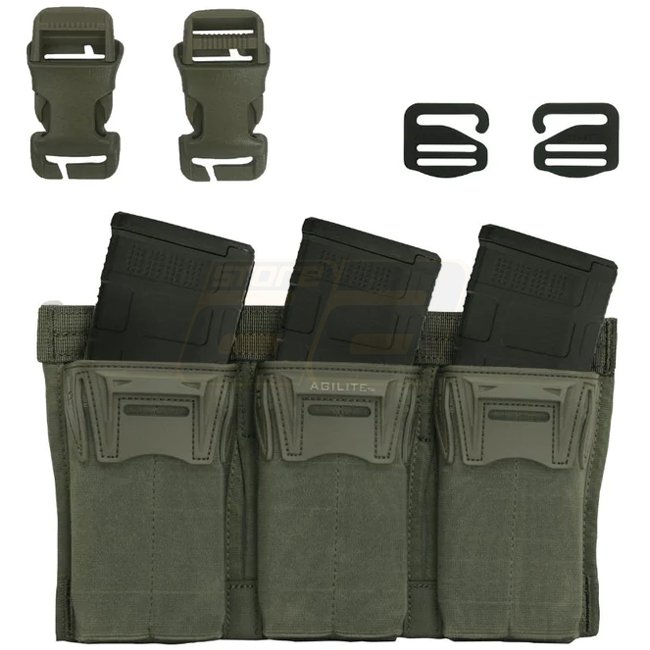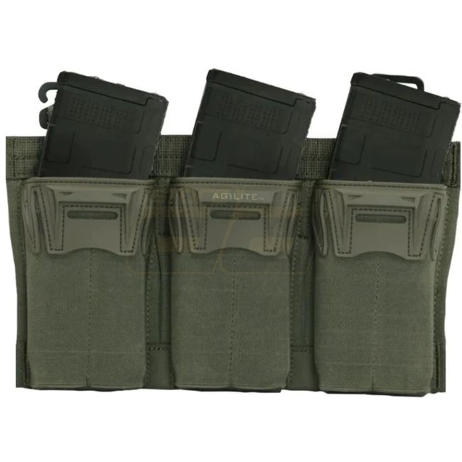 Agilite Pincer Placard en vert Ranger avec un design de magwell entonnoir breveté. Peut contenir trois chargeurs AR15/M4. Léger à 161g, compact à 25x9cm. Boucles MOLLE et crochets G inclus.