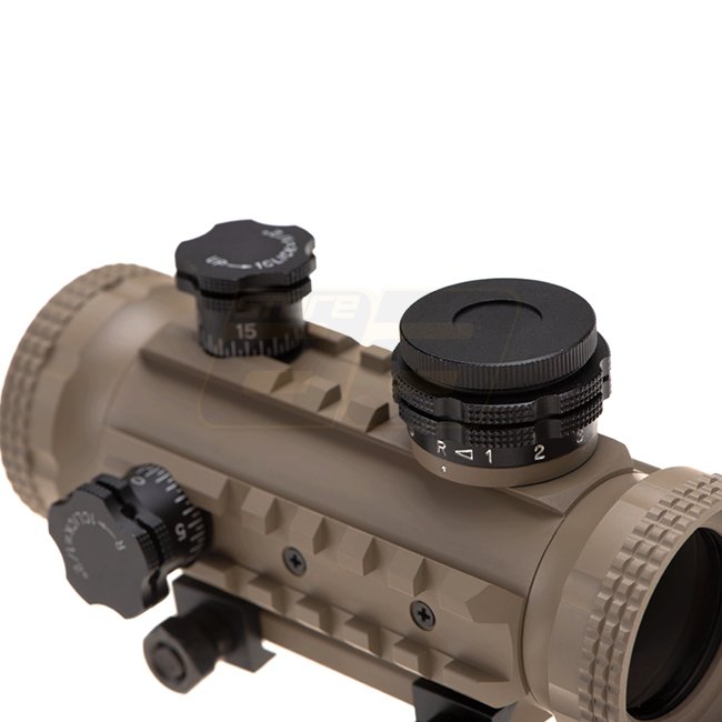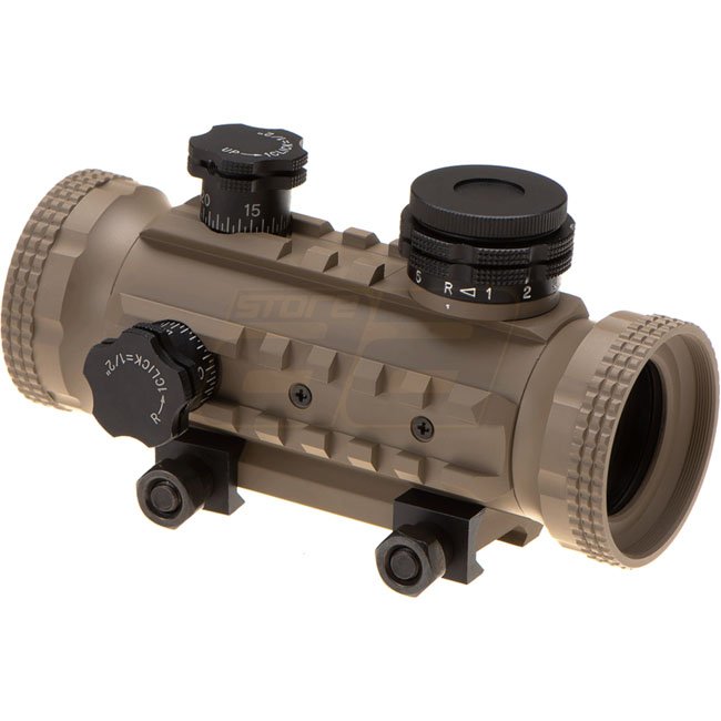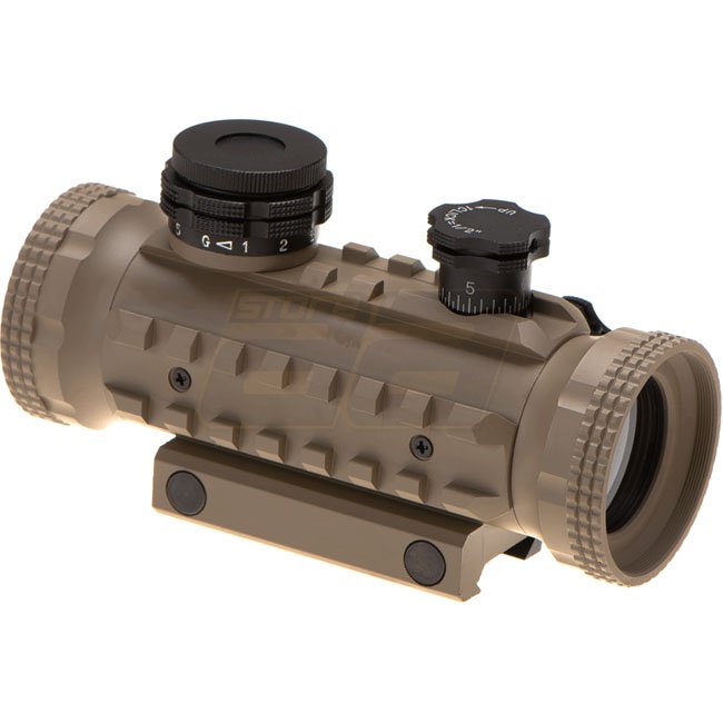 Aim-O 1x30 Point Rouge - Terre Foncée : 1x de grossissement, lentille de 30mm, illumination rouge et verte, réticule en point, ajustable en dérive et en élévation. Montage de 20mm, longueur de 140mm. Piles non incluses.