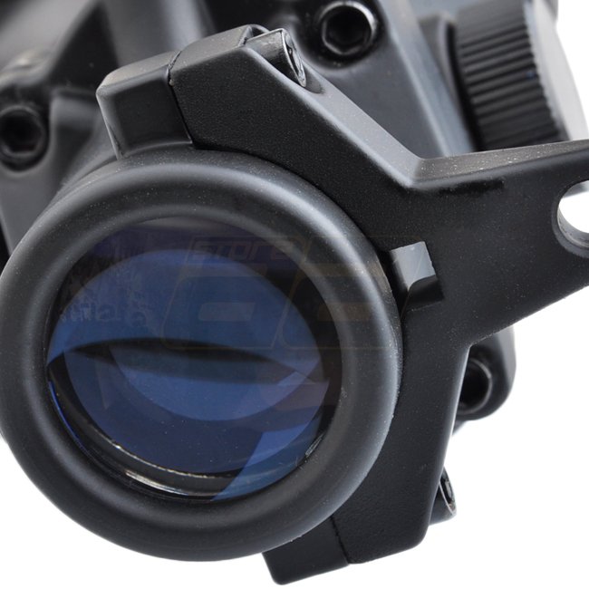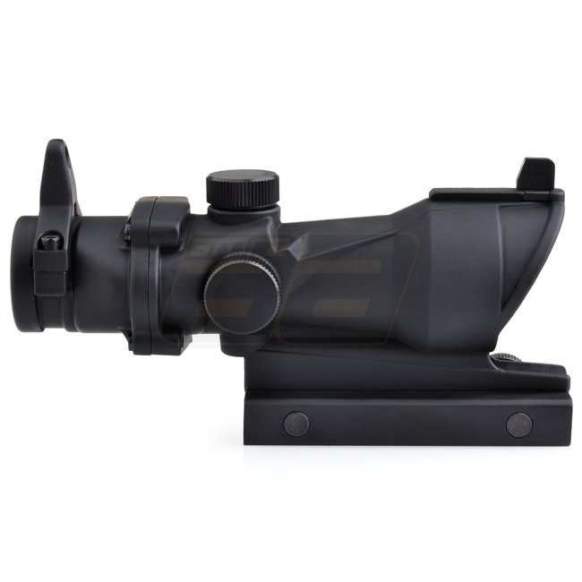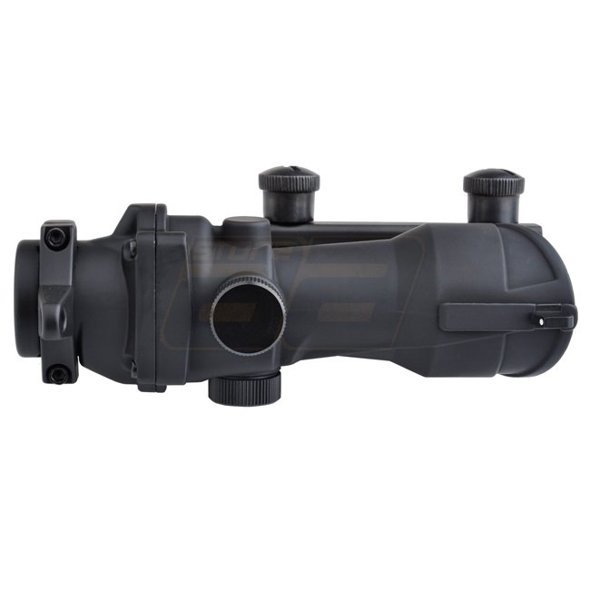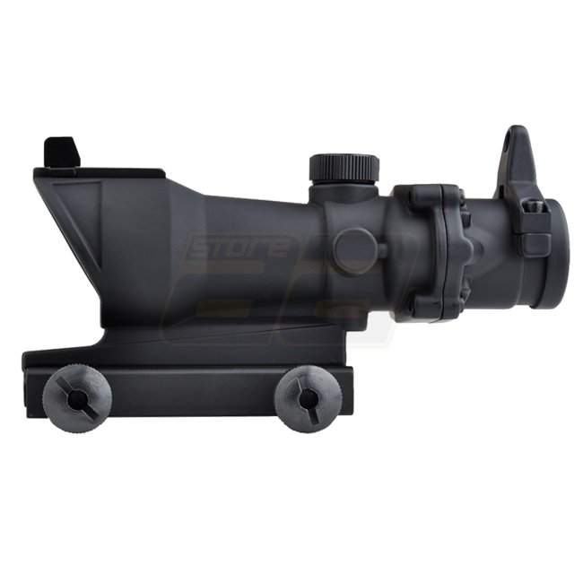 Visée Aim-O ACOG 4x32 - Noir. La lunette possède un grossissement de 4x, un diamètre de lentille de 32 mm, et un réticule réglable pour le vent et l'élévation. Parfait pour les montages Picatinny de 20 mm, avec une longueur de 150 mm.