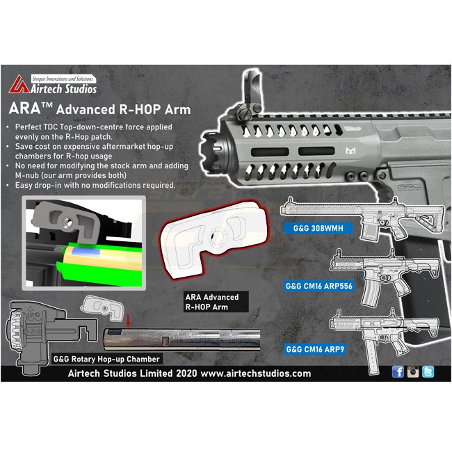 La technologie avancée R-HOP de Airtech Studios G&G améliore la précision à longue distance. Améliore la trajectoire des billes pour des tirs précis. Compatible avec les fusils G&G.
