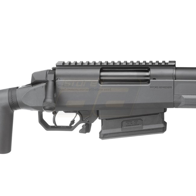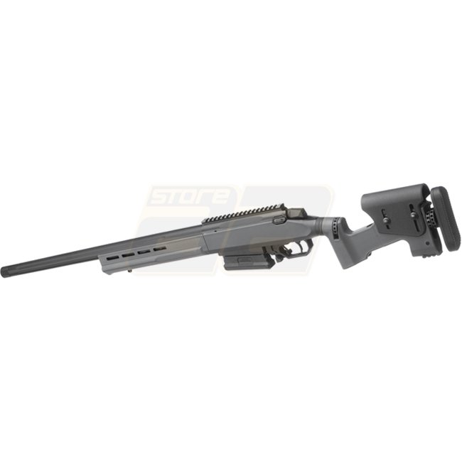 Fusil de précision à ressort Ares Striker AST-01 - Gris. Crosse en métal/polymer, chargeur de 45 coups, longueur de 1070 mm, poids de 3000 g, canon intérieur de 555 mm, 410-430 FPS, mode à tir unique, hop-up réglable. Package : Arme, Chargeur.