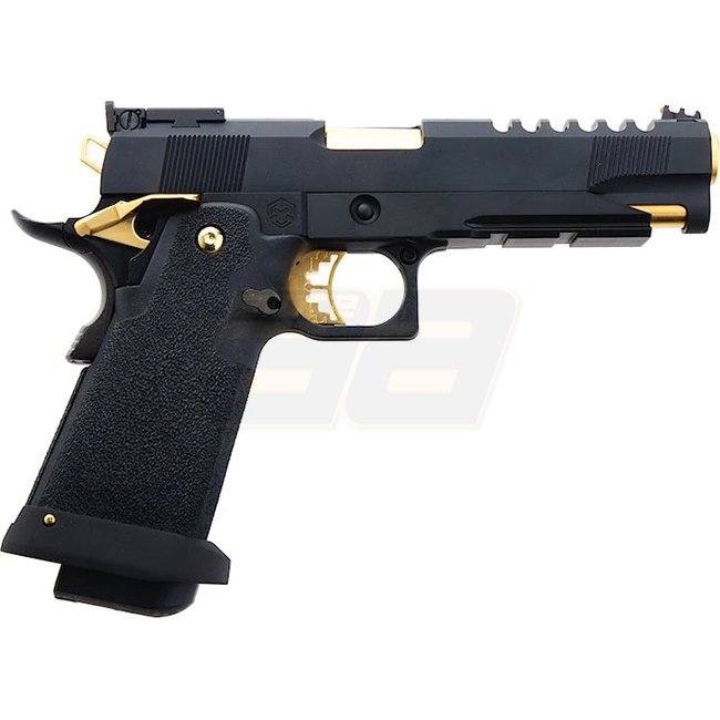 Le pistolet à gaz à blowback Armorer Works 5.1 HX27 - Gold est un pistolet airsoft premium avec une construction en métal et en polymère, doté d'une capacité de chargeur de 30 coups.