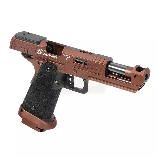 Pistolet à gaz Blowback de couleur Sand Viper avec une capacité de 28 coups. Fabriqué en polymère de haute qualité avec des pièces métalliques. Dispose d'une glissière