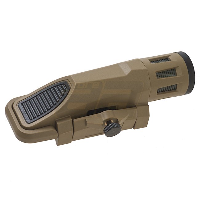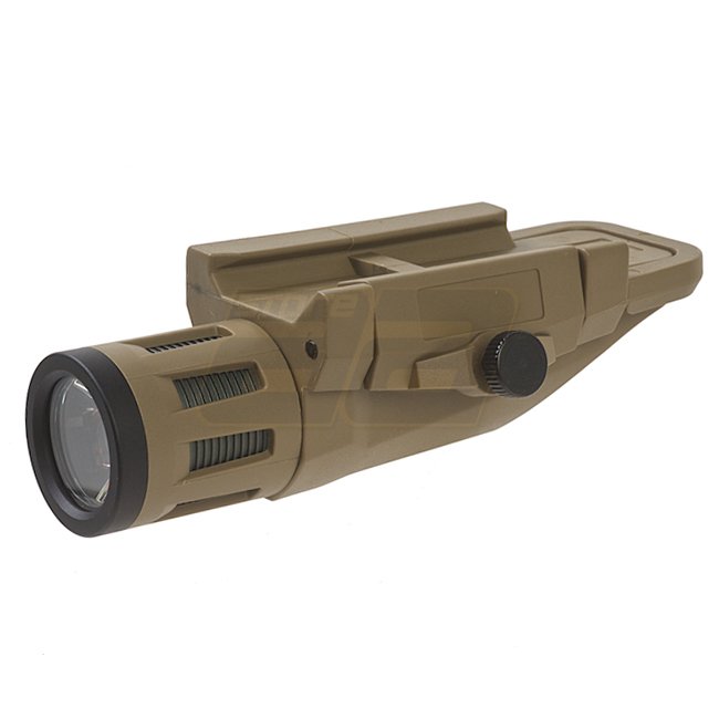 Lampe d'arme Blackcat WML compacte de couleur Tan, idéale pour les opérations tactiques. Fournit 200 Lumens de luminosité LED avec des modes constant et momentané. Livrée avec un interrupteur à pression et un support Picatinny.