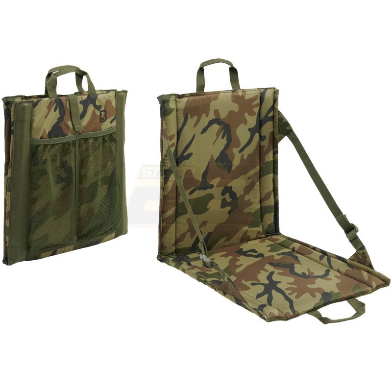 Siège pliable Brandit - Woodland : Siège pliable avec dossier, idéal pour le camping, les festivals, la randonnée, les vacances à la plage ou la vie quotidienne. Dispose de poignées stables, de fermetures velcro, d'un dossier réglable et d'un matériau en