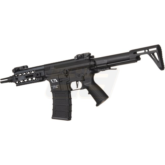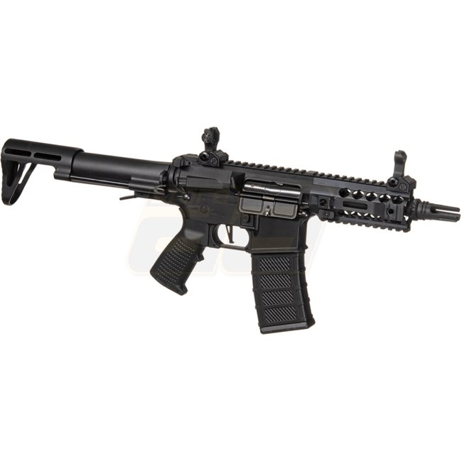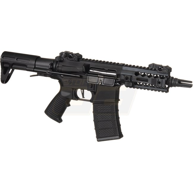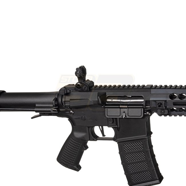 Fusil d'assaut AEG Classic Army AR-4 SBR de haute qualité en noir élégant. Construction en métal avec crosse en polymère et poignée pistolet. Capacité du chargeur de 300 billes, longueur de 550-640 mm et poids de 1900 g. Modes de tir semi-automatique et a
